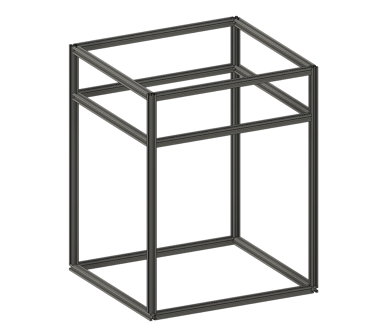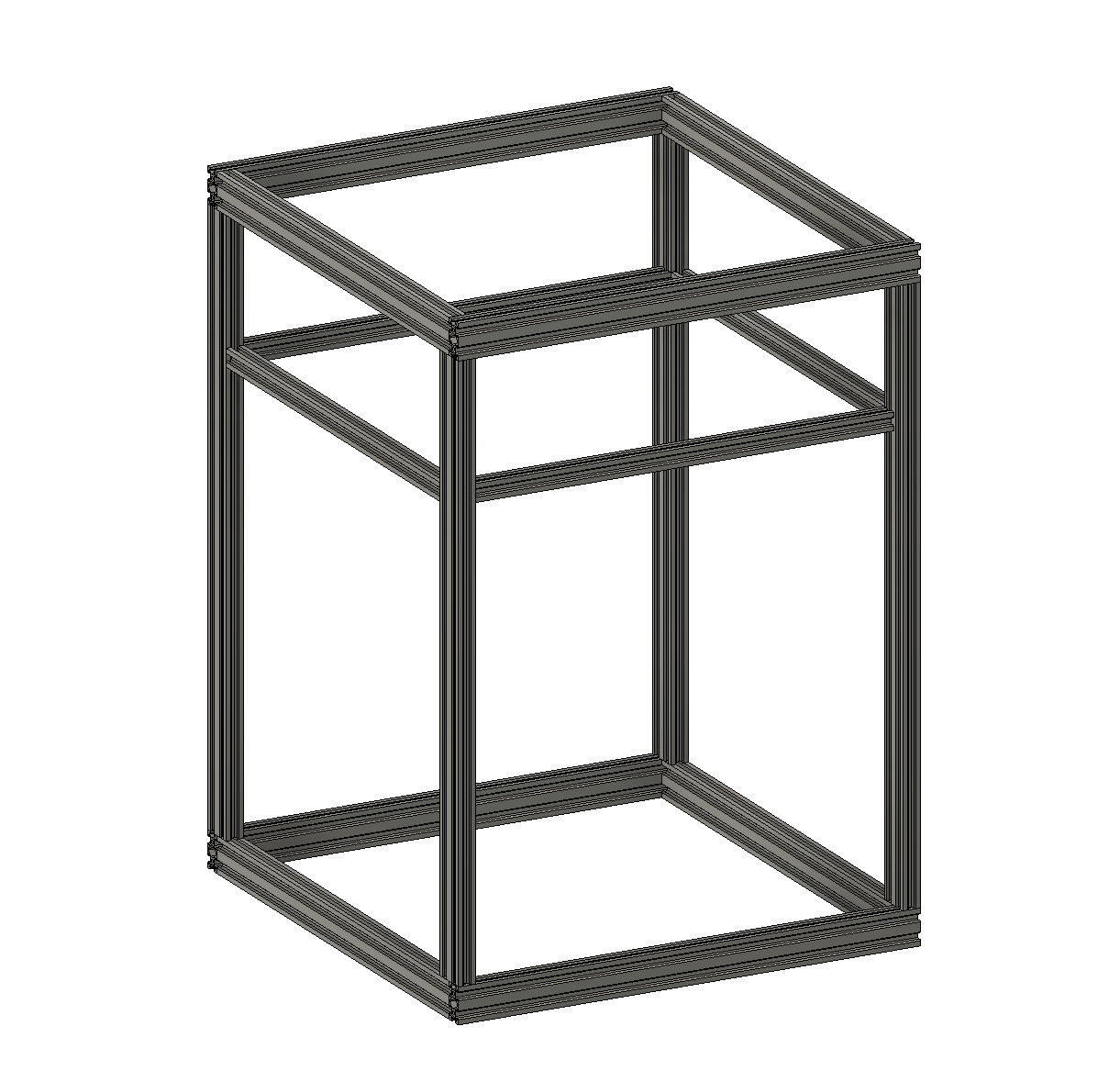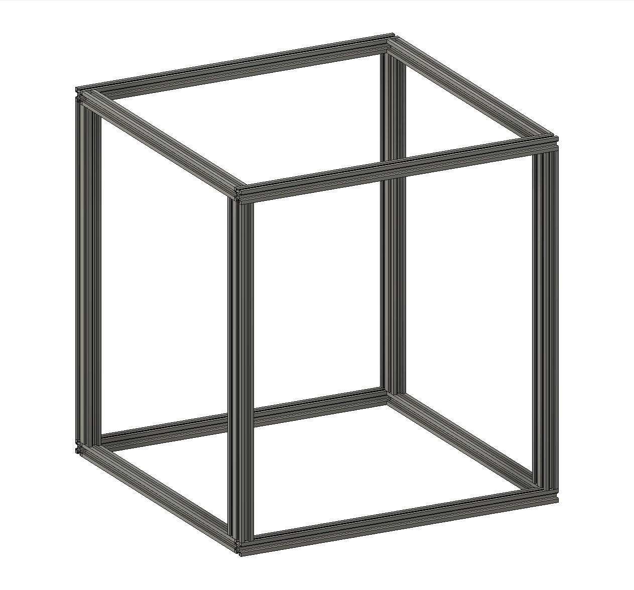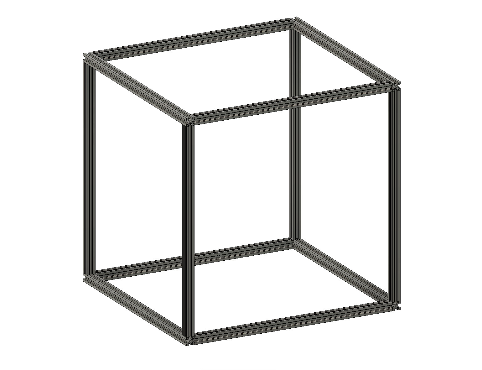 A printer frame is the structure that holds all of the guts in the right places. The dimensions of the frame are often upper limits on things like bed size and Z-height and the rigidity and squareness of the frame directly impact the speed and accuracy of prints. Aluminum extrusion is the most common build material for medium and larger printers however acrylics, fiberboard, steel, wood and other materials can be used for specific applications. The Big Plans printer system calls for a 2020-based cube frame although 2040 can also be used with some caveats. The most basic 2020 cube frame uses twelve extrusions with three sets of four that share the same length (eg: 4x500mm, 4x450mm, 4x400mm = 12).