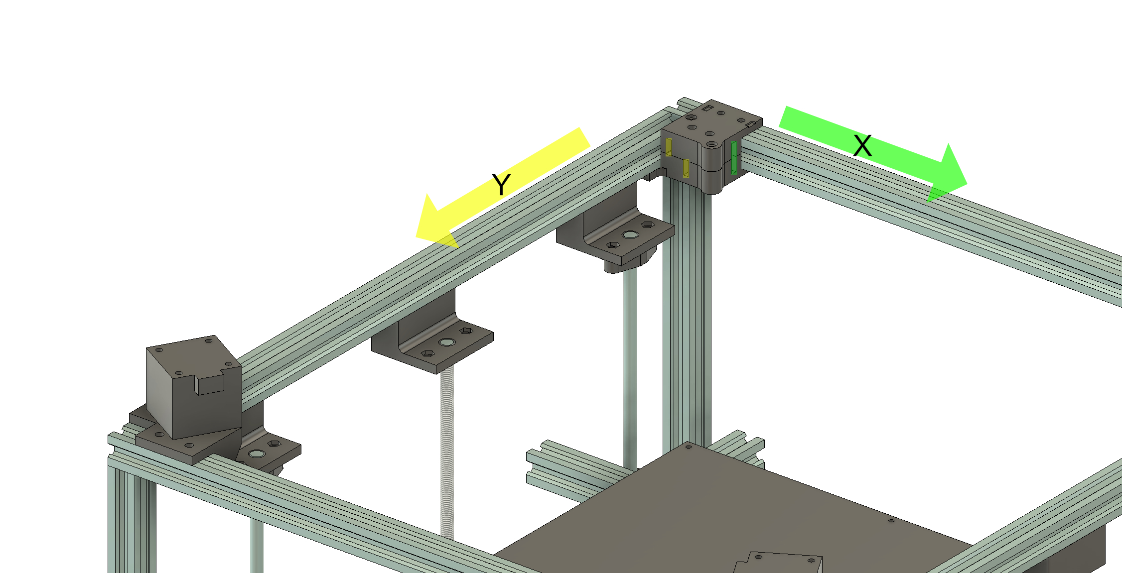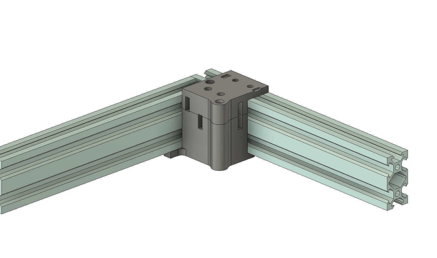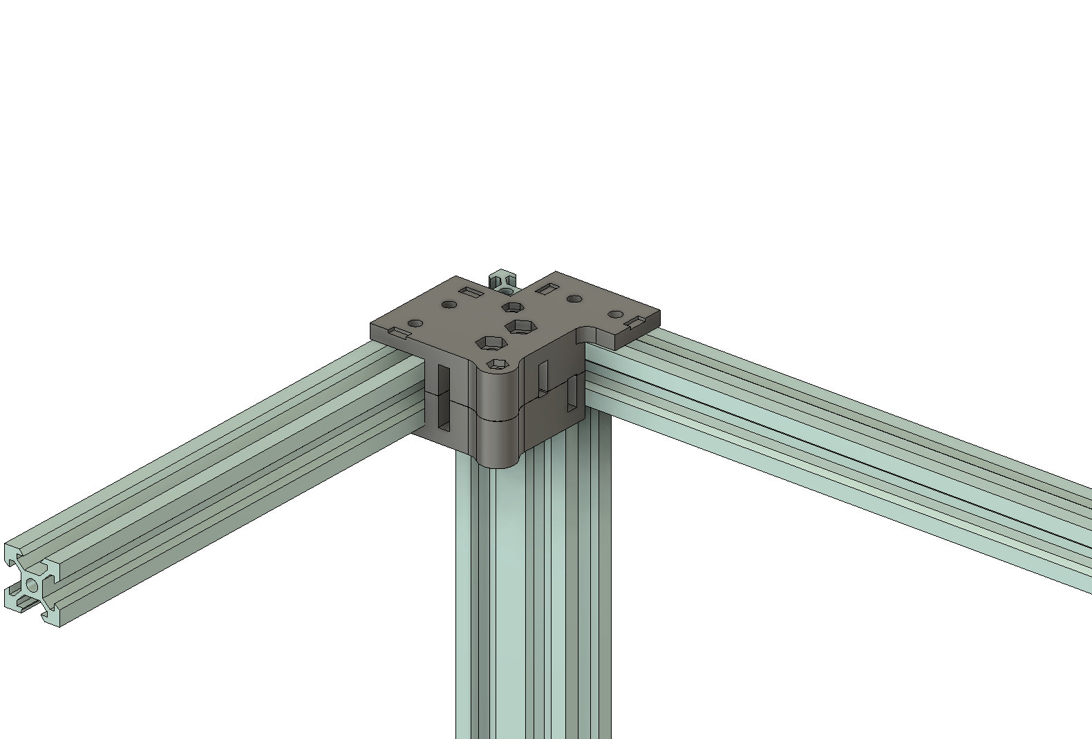 The blocks should be oriented such that the aligned cable exits go along the X axis while the offset cable exists go along the Y axis. There are notches in the blocks so that 2040 corners can still be used to secure the frame pieces.