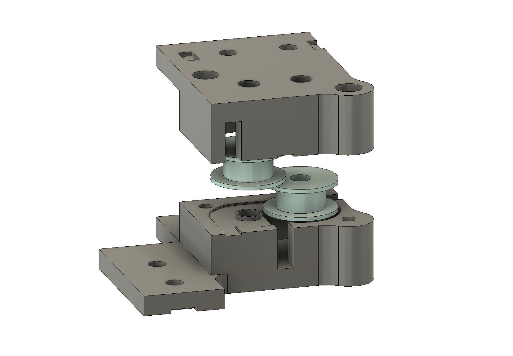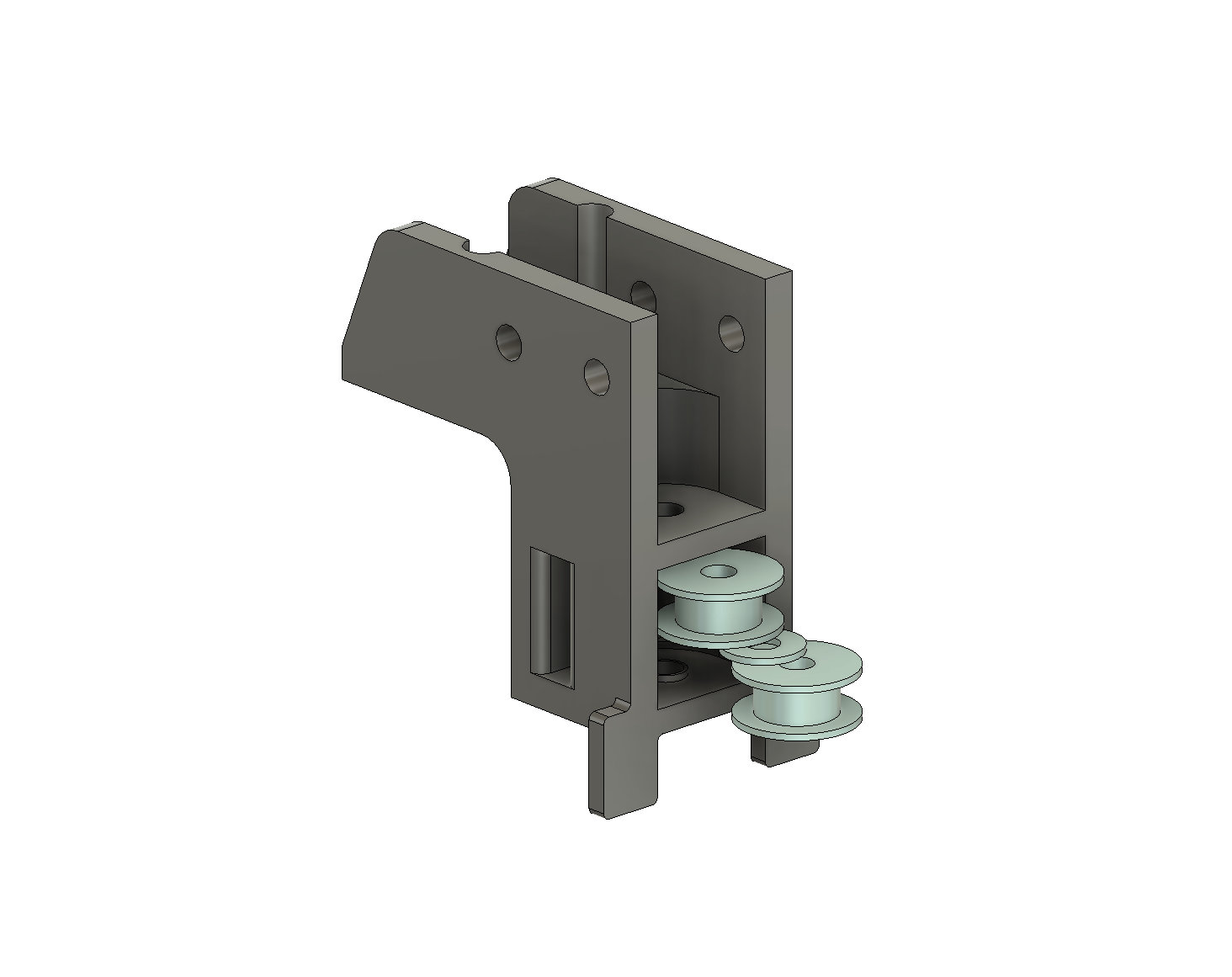 The pulley blocks each require two GT2 pulleys. The pulleys simply slot into the gaps in the pulley blocks - no spacers or anything required. The blocks are held together using m3 nuts and bolts and can be completely assembled before being attached to the frame. When inserting the m5 bolts, they can be inserted from the top and left without nuts however if you want to use m5 nuts be sure to be very gentle when tightening them. Any pressure at all could bend the mount and introduce friction. If the nut touches the plastic then it's tight enough.